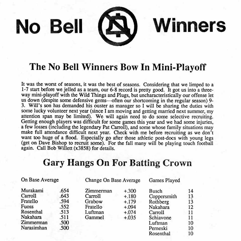 In 1988, the No Bell Winners were the Murray Hill softball league champs.  Click on the image for a larger picture.